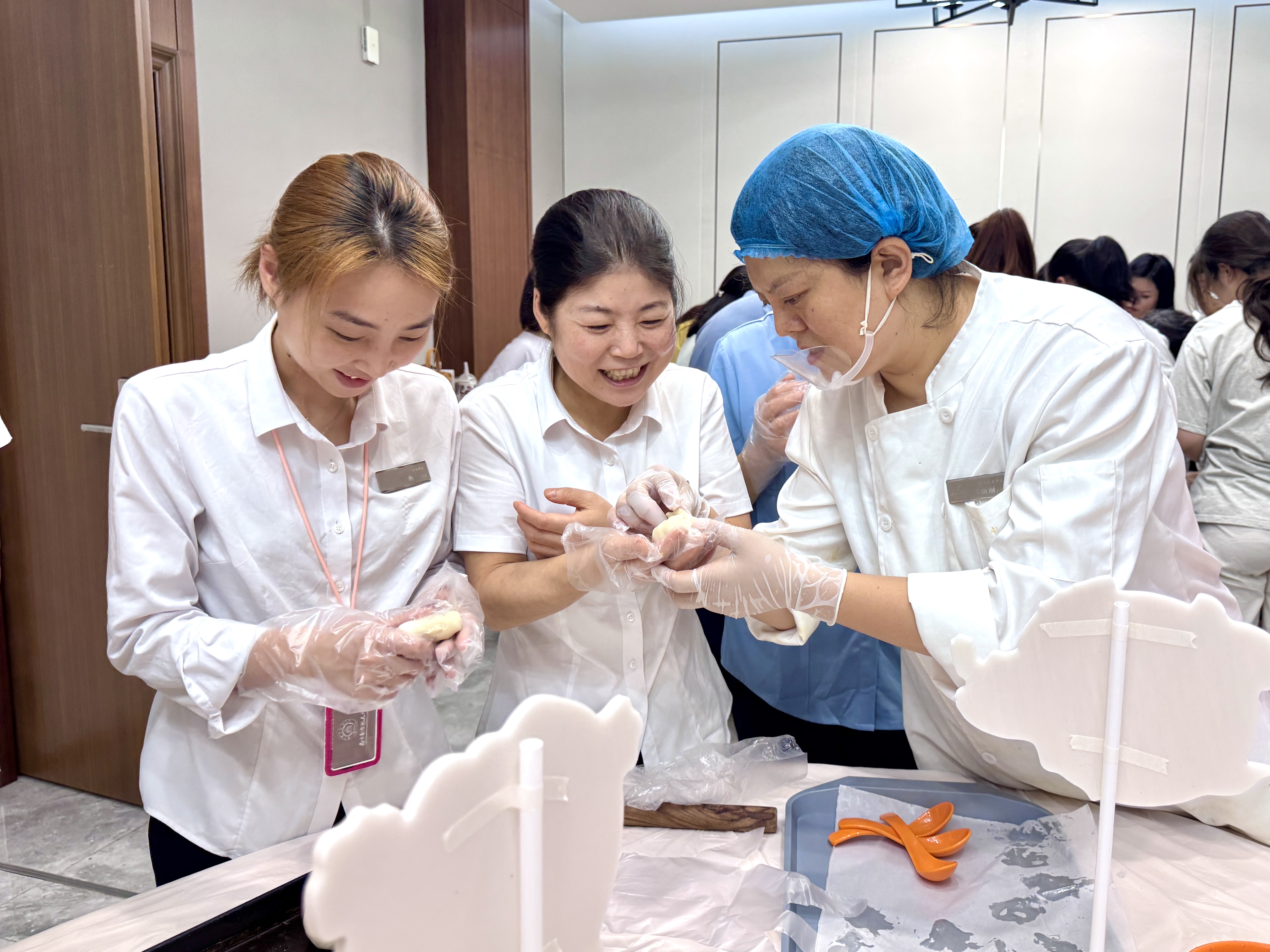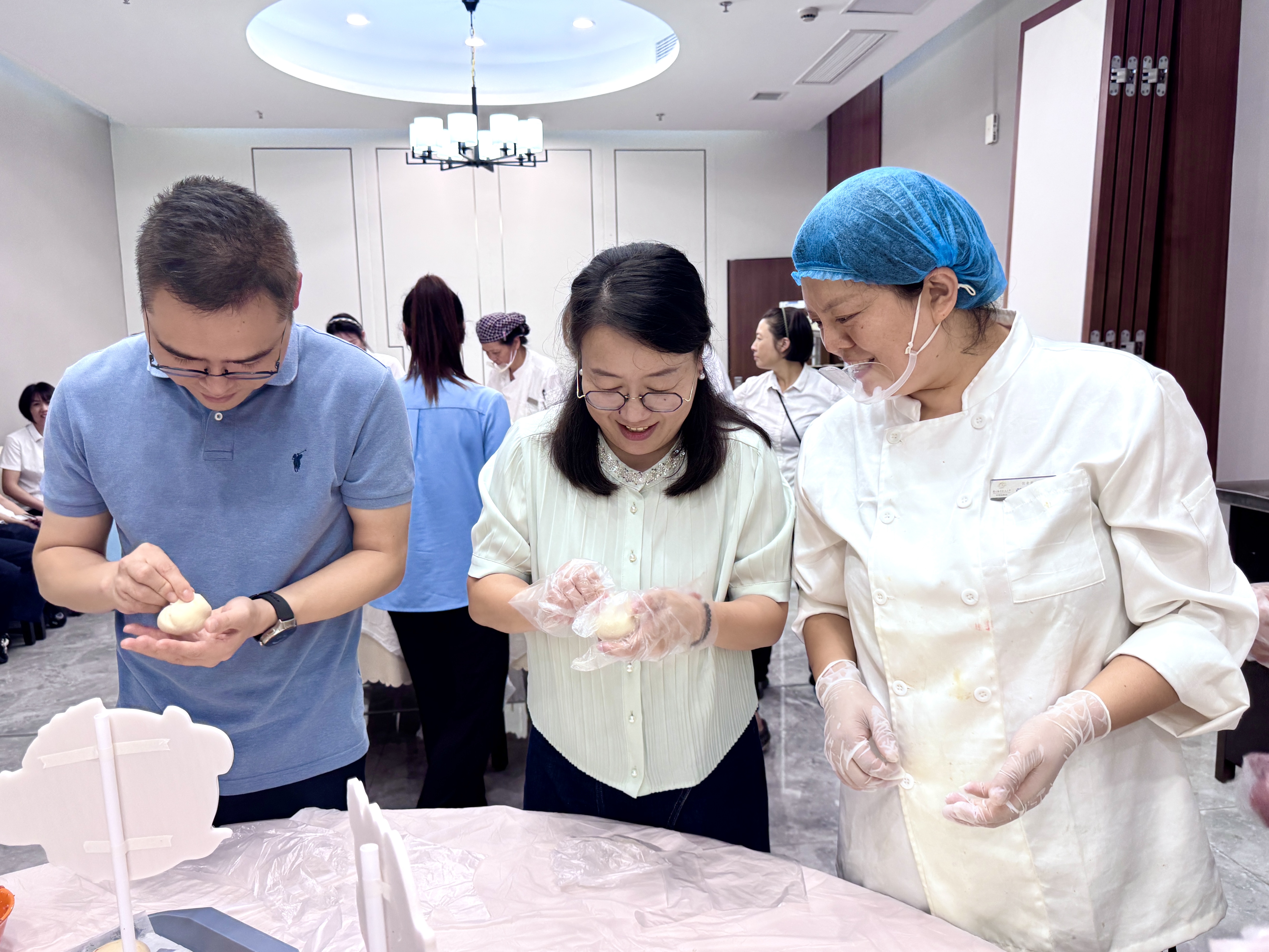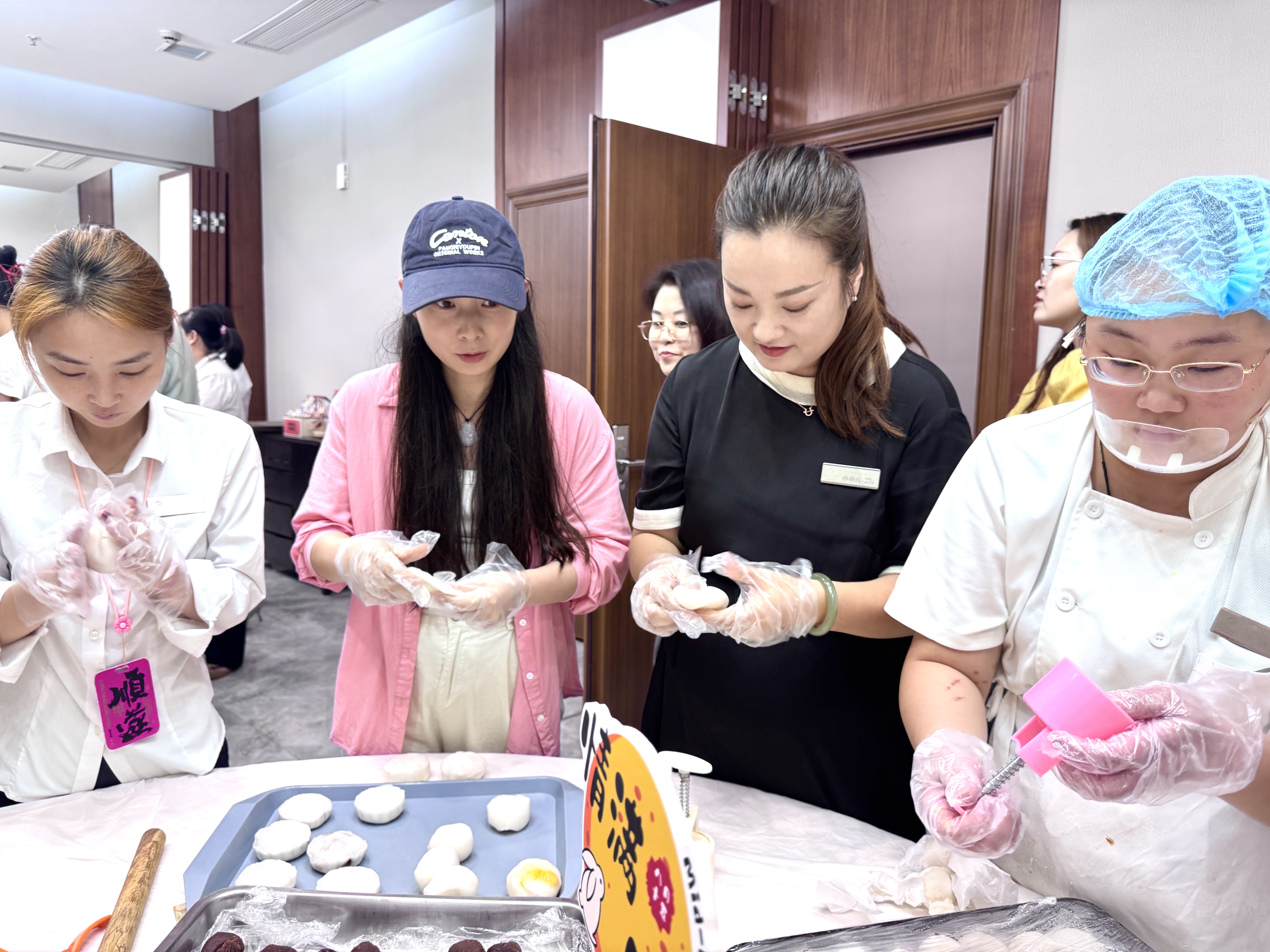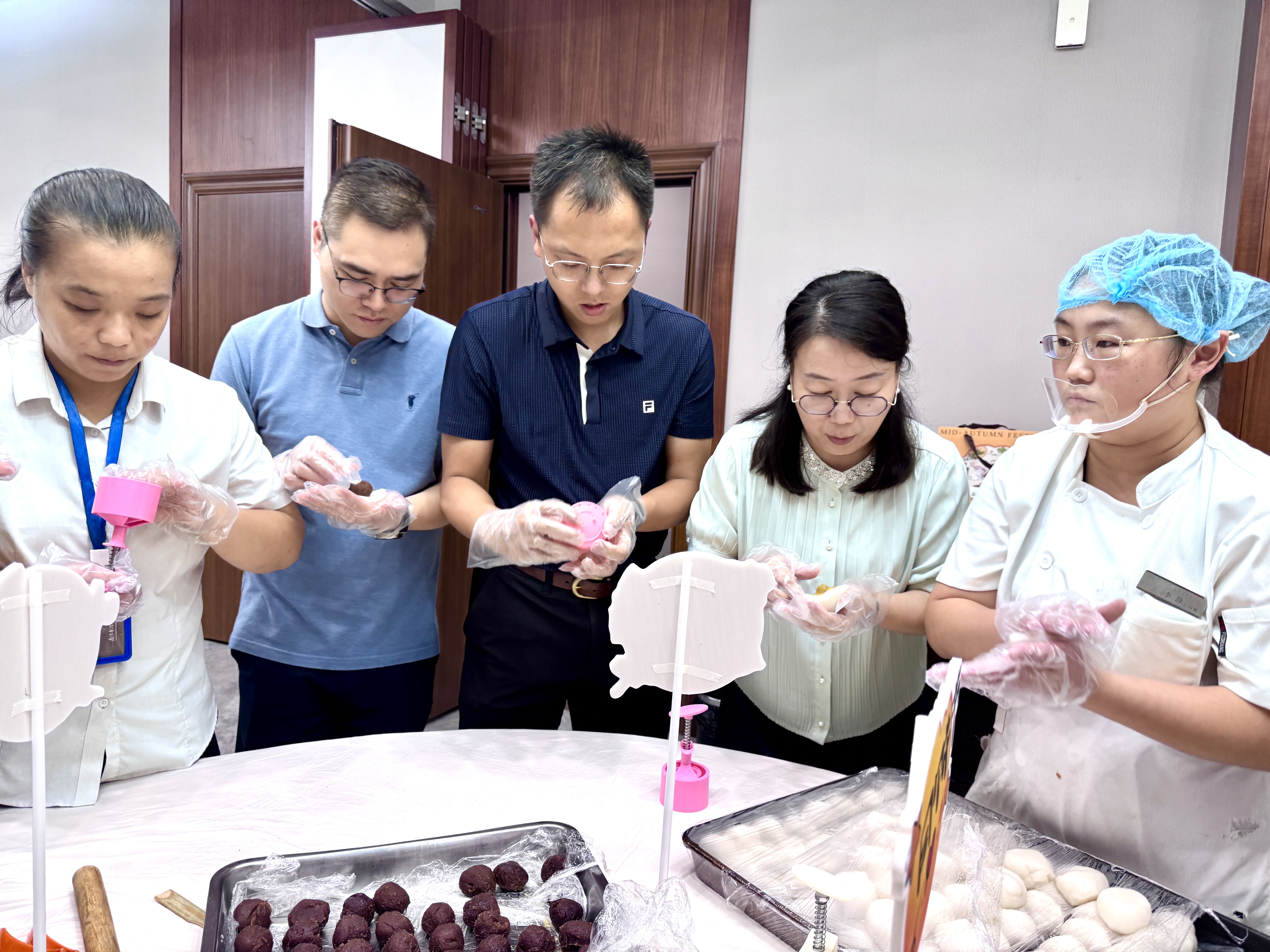 此次活动分为冰皮月饼和苏氏月饼两种。在专业老师的带领下,大家纷纷戴上手套,迫不及待地投入到月饼制作中。冰皮月饼制作区,员工们搓揉面团,包裹香醇的馅料,按压独特的造型,共同制作了不同样式的冰皮月饼。