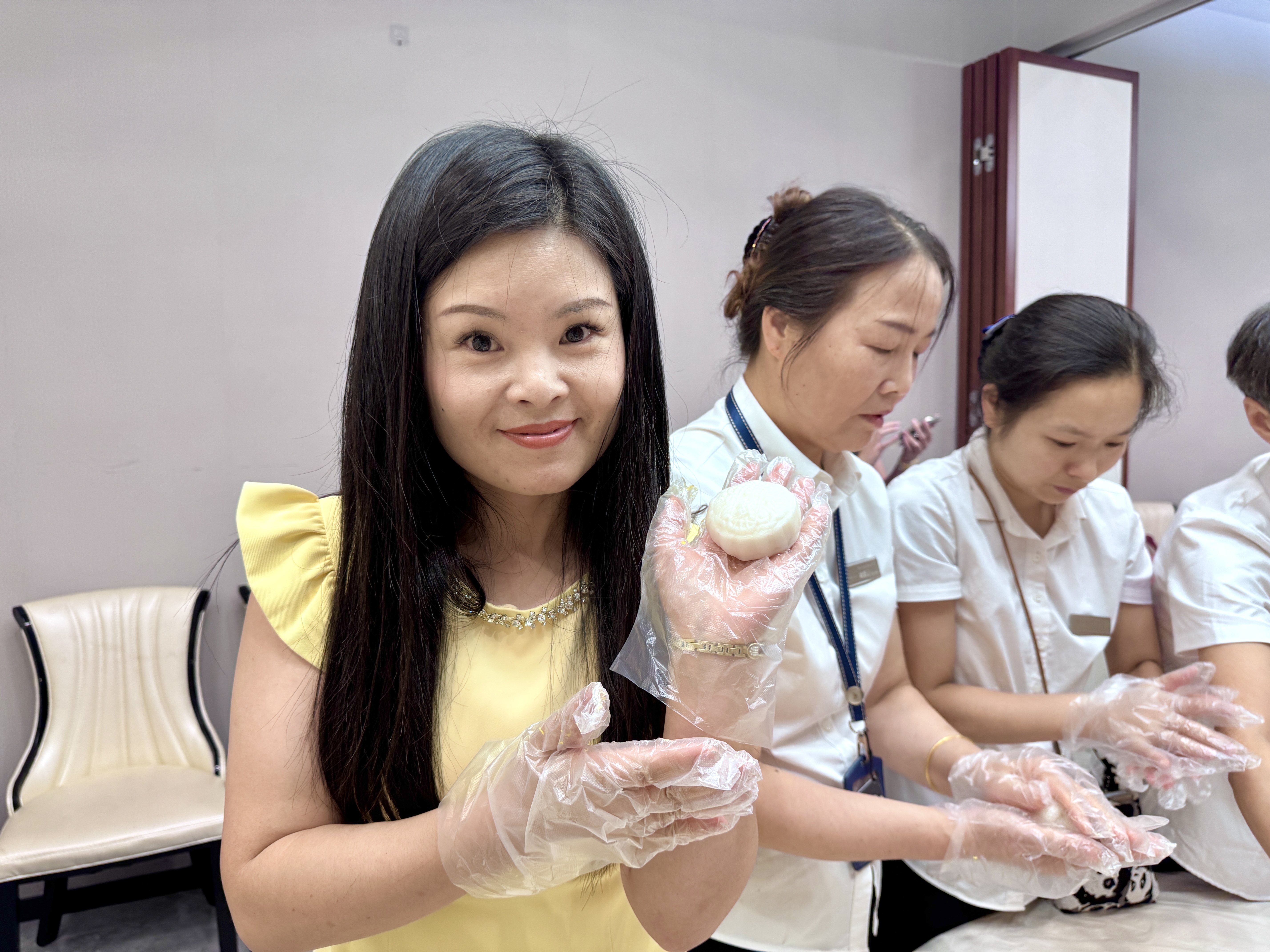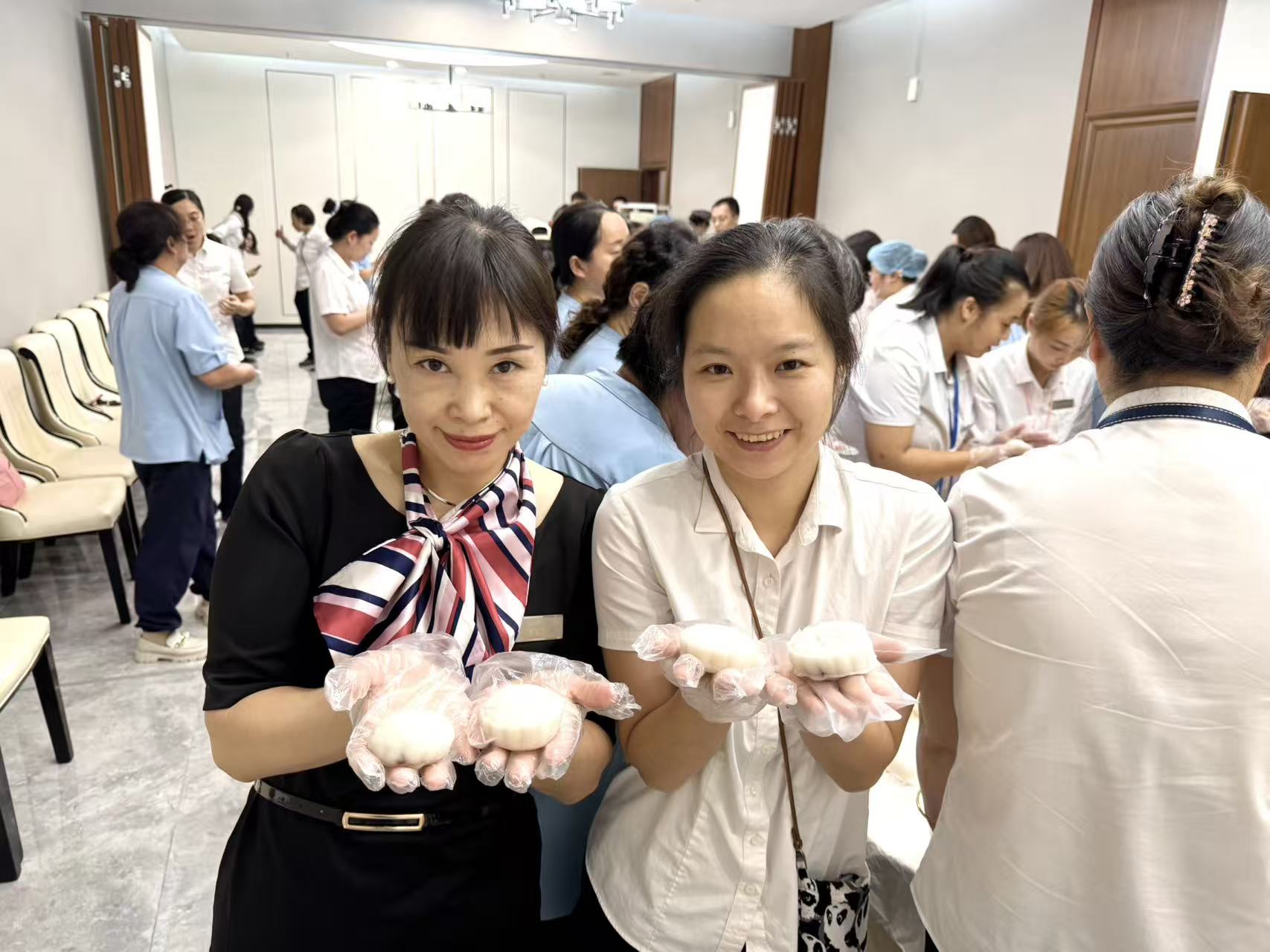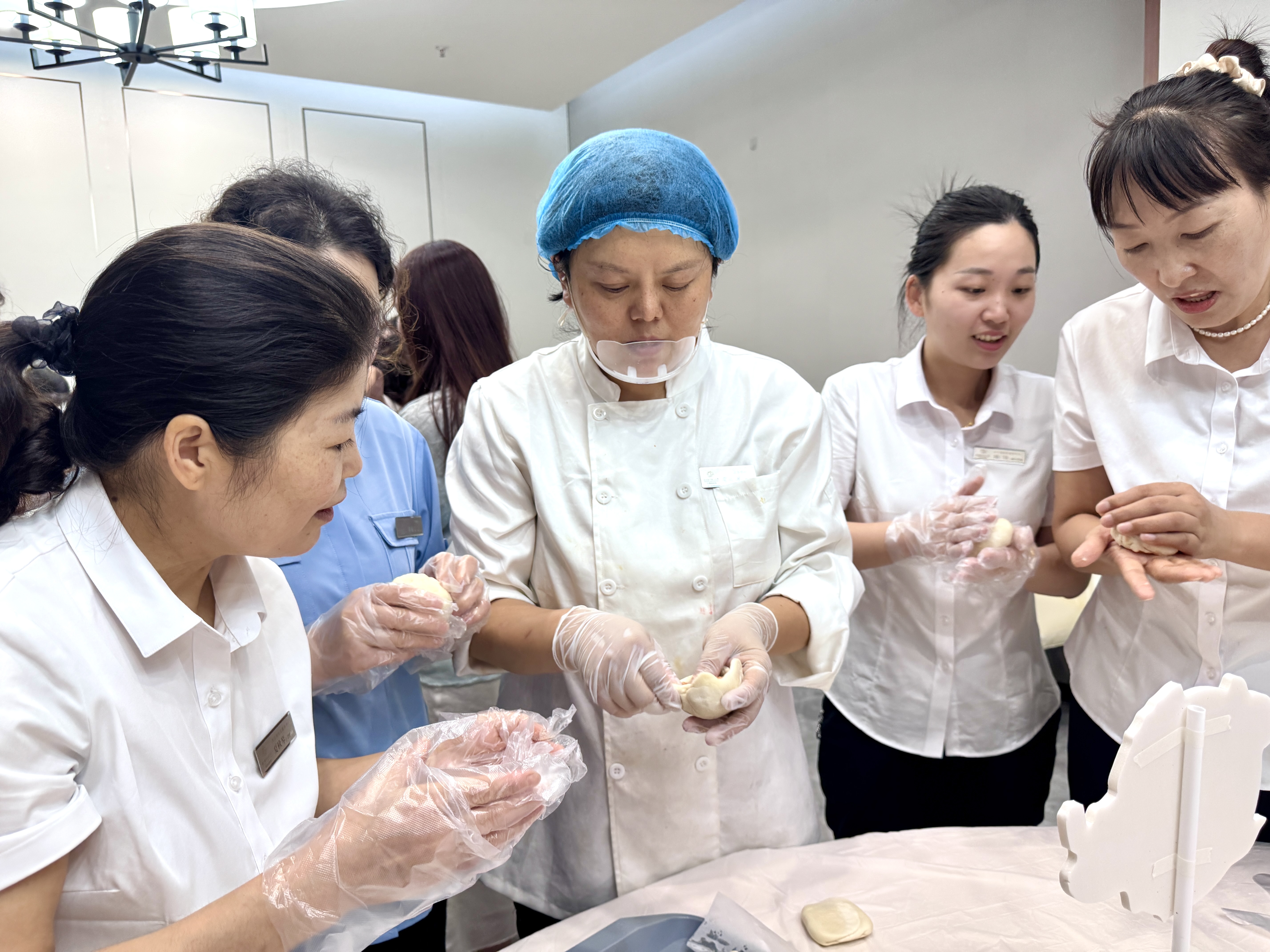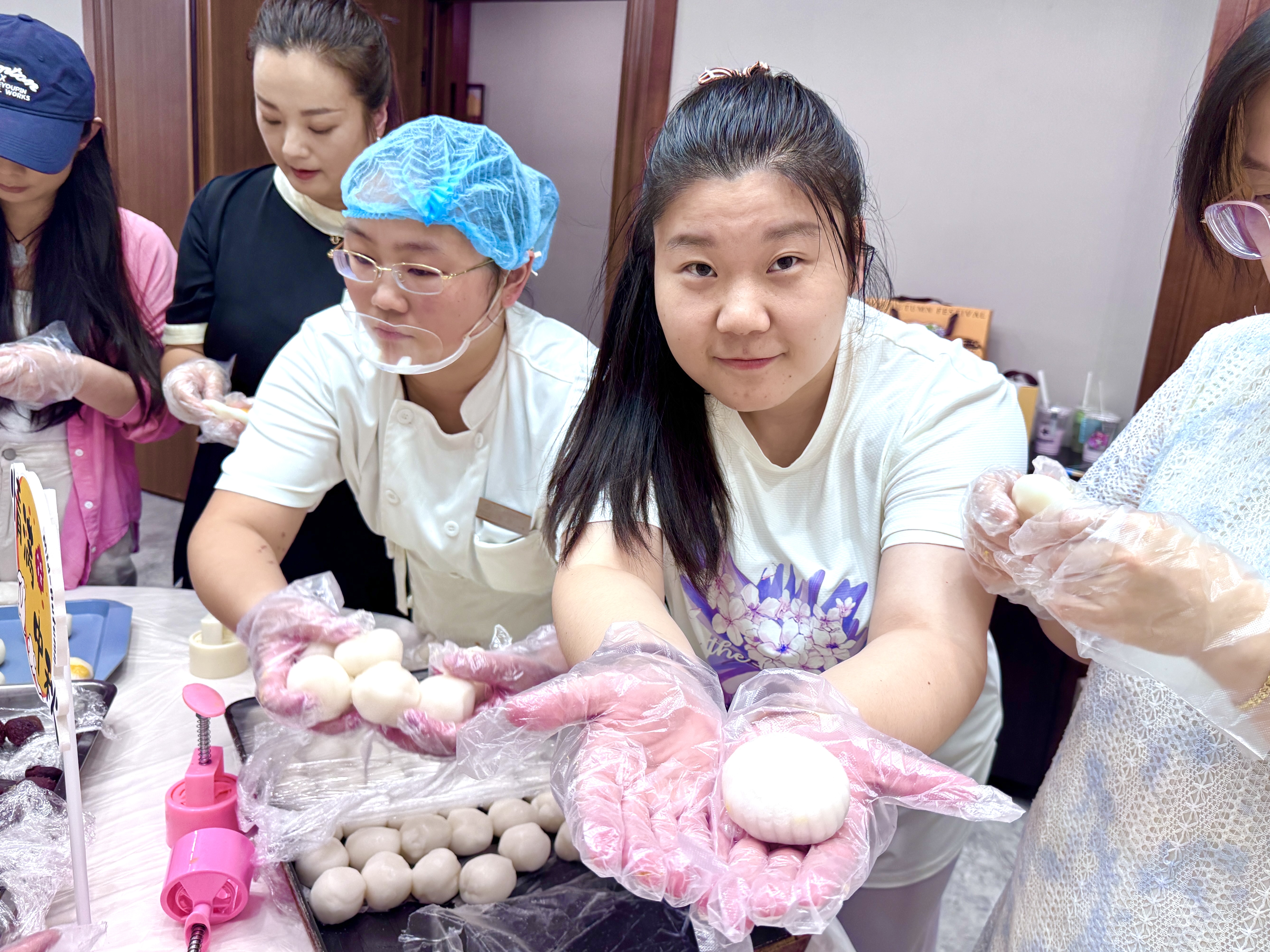 此次活动分为冰皮月饼和苏氏月饼两种。在专业老师的带领下,大家纷纷戴上手套,迫不及待地投入到月饼制作中。冰皮月饼制作区,员工们搓揉面团,包裹香醇的馅料,按压独特的造型,共同制作了不同样式的冰皮月饼。