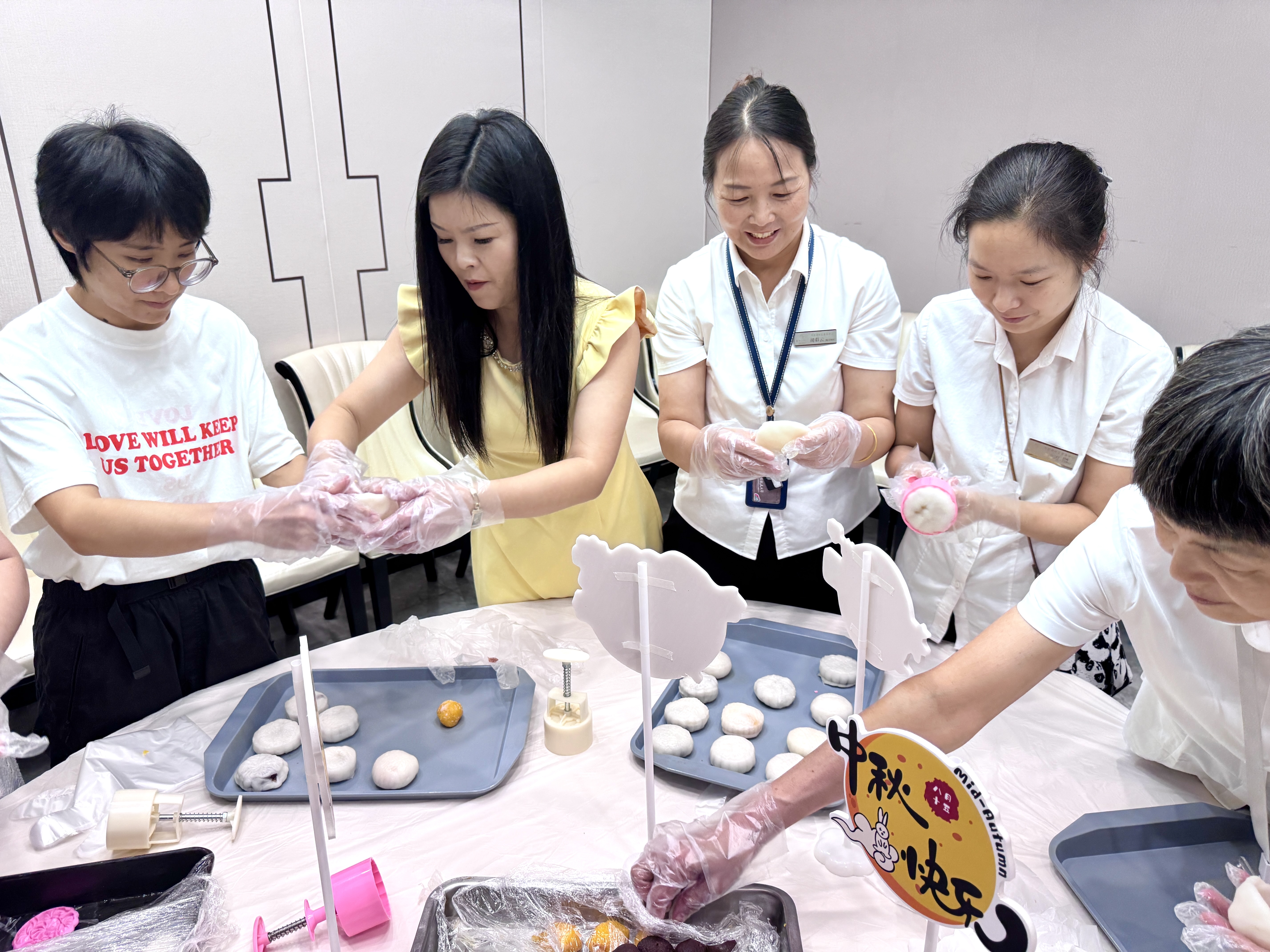 整个活动现场,揉面的沙沙声、模具按压的轻响与大家的欢声笑语交织在一起,汇成了最温暖的中秋序曲。虽然最终完成的月饼模样算不上百分百“标准完美”,但每一个都承载着制作者的用心与对中秋的美好期待,是独一无二的 “手工限定款”。
