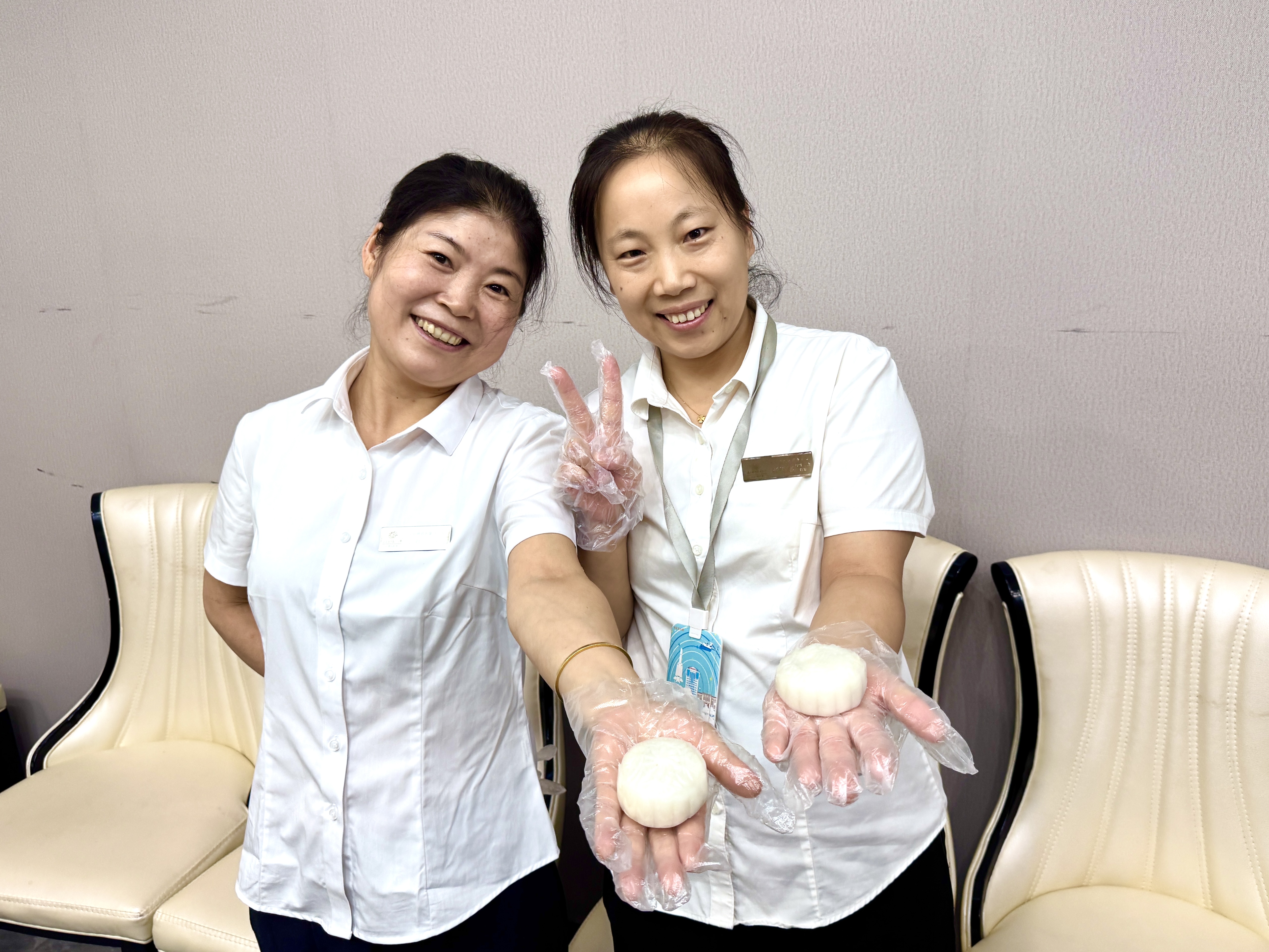 另一边的苏式月饼制作区则更显“匠心满满”。员工们围在一起,包制、擀皮、塑形,每一个步骤都在欢声笑语中有条不紊地推进,指尖翻飞间,一个个形态规整、满含匠心的生胚逐渐成型,空气中也慢慢弥漫开面粉与馅料交融的清甜香气。