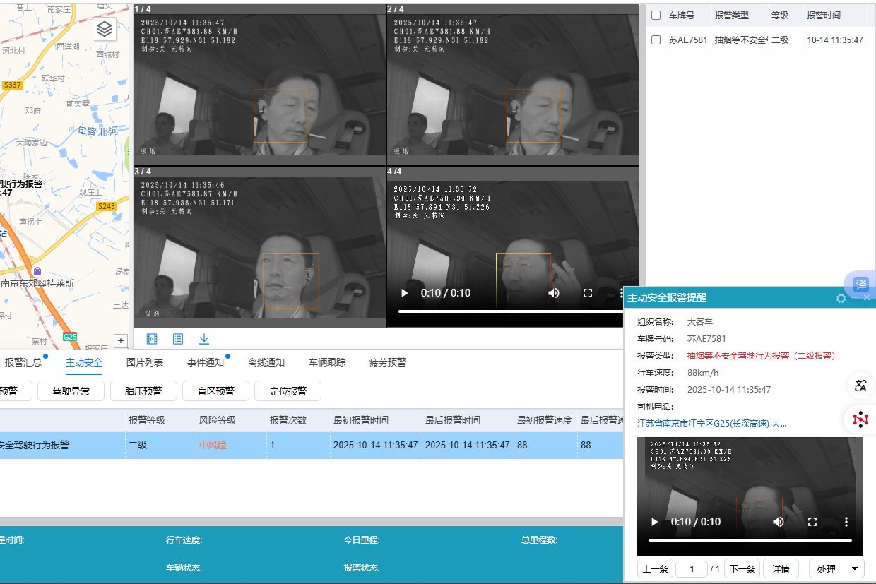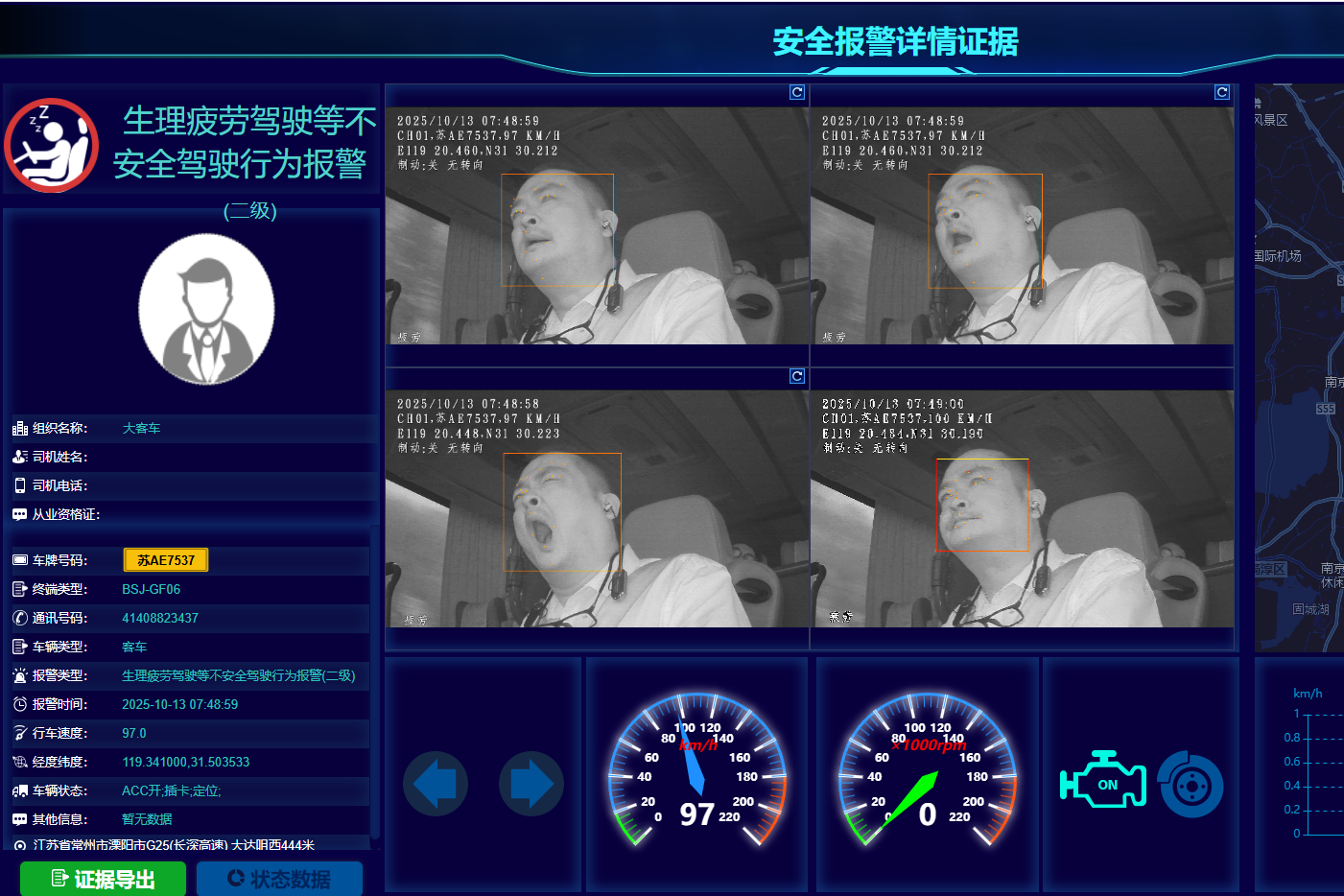 在道路运输中主动防控,快速响应与高效处置至关重要。升级后的车载防控系统构建了“车载终端-后台平台-现场人员”的联动处置机制,一旦发生紧急情况(如驾驶员犯困、违规、车辆故障、交通事故),车载终端一键报警,系统立即将报警信息同步至后台管理平台,给安全行车加注双保险。